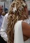 Свадебная причёска в греческом стиле особенно стильно смотрится на длинных и густых волосах. Пряди зачёсываются наверх и искусно переплетаются друг с другом. Лёгкие локоны струятся на плечи и спину. Укладка смотрится естественно и очень нежно. Такую причёску можно украсить живыми цветами, бусинами и сверкающей диадемой.