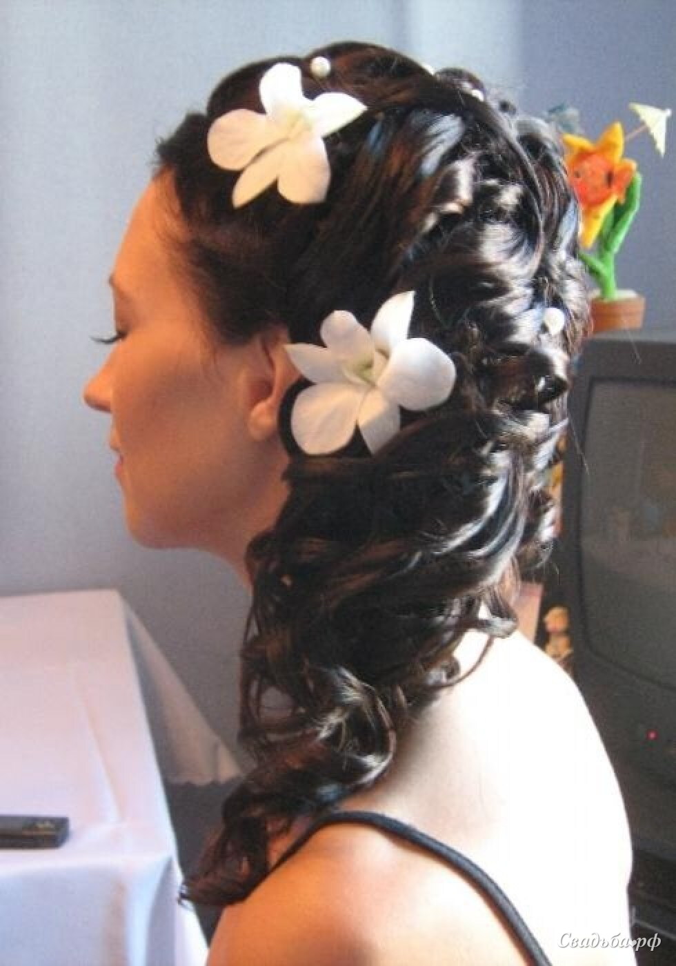 Свадебная причёска в греческом стиле украшена цветами. Отличный вариант для обладательниц длинных и густых волос. Пряди зачёсываются наверх и искусно переплетаются между собой. Такая объёмная модель эффектно смотрится с овальным или худеньким личиком. Укладку можно дополнить бусинами и миниатюрными заколками.