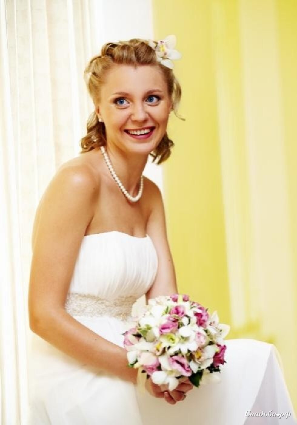 Свадебная причёска с живыми цветами подойдёт молодым и нежным модницам. Пряди уложены в широкие локоны и слегка зафиксированы на затылке. Такая модель может быть украшена фатой и несколькими бусинами. Отличный вариант для коротких и средних волос. Представленная укладка будет отлично смотреться с любым типом лица.