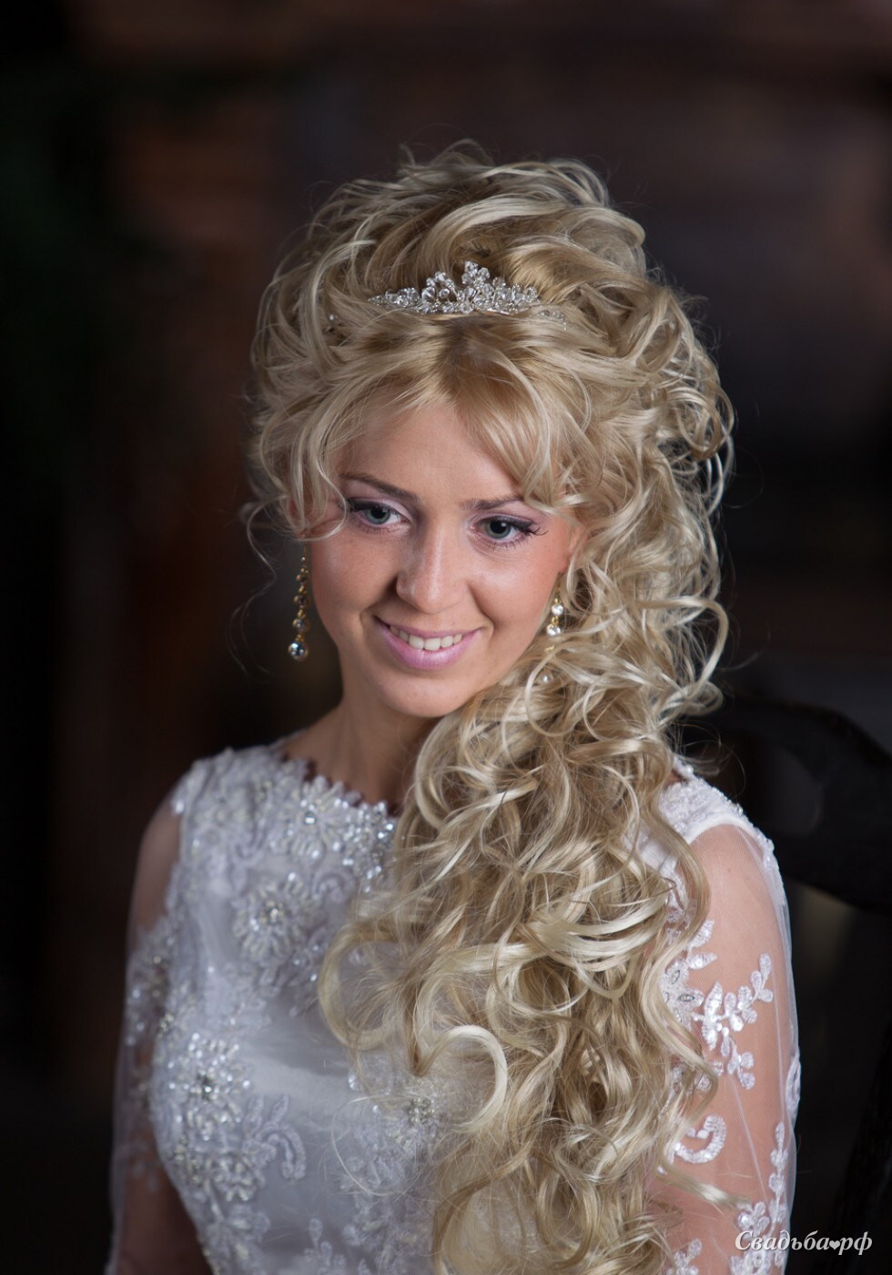 Поистине королевская свадебная причёска выполнена в греческом стиле. Укладка сделана на коротких волосах с использованием шиньонов. Каждая прядь аккуратно завита в локон и надёжно зафиксирована на затылке. Настоящий каскад кудрей струится на плечо. Причёска украшена сверкающей диадемой. Модель смотрится объёмно и торжественно.