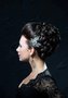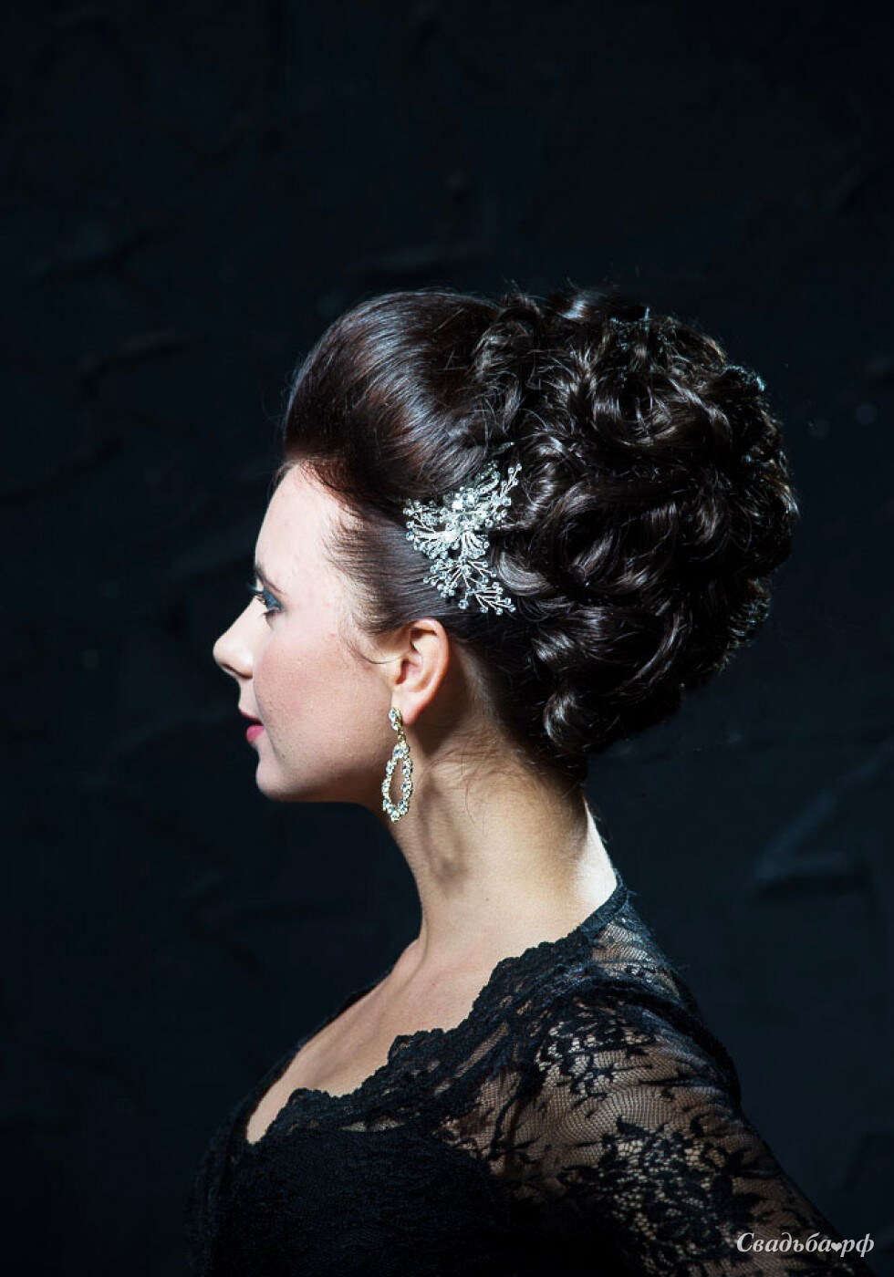 С такой свадебной причёской Вы почувствуете себя настоящей императрицей. Модель выполнена на коротких волосах с использованием шиньонов. Волосы зачёсаны наверх и зафиксированы в объёмную конструкцию. Причёска открывает шею и лоб, акцентируя внимание на лице невесты. Пряди завиты в локоны и аккуратно уложены. Укладка дополнена сверкающей заколкой.