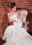 Эффектная свадебная причёска с забранными на затылок волосами открывает лоб и шею невесты. Волосы убраны и зафиксированы в объёмную конструкцию. Каждая прядь завита в локон и аккуратно уложена. Концы волос окрашены в более светлый оттенок, что придаёт образу особый шик. Сбоку спускается миниатюрная кудряшка. Причёска украшена живыми цветами.