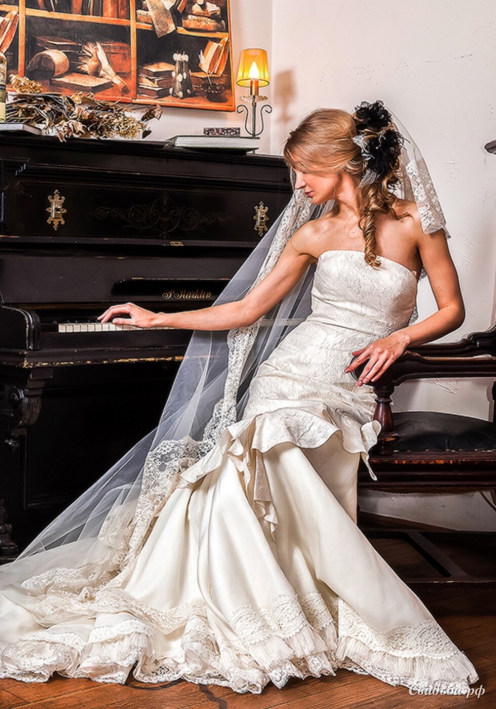 Романтичная свадебная причёска в ретро-стиле выполнена на длинных волосах. Пряди легко зачёсаны назад и зафиксированы на затылке. Модель выглядит естественно, а нежные пряди обрамляют лицо. Упругие кудри ниспадают на плечи. Изюминка причёски – крупная заколка с перьями и эффектная фата. Укладка акцентирует внимание на плечиках и шее невесты.