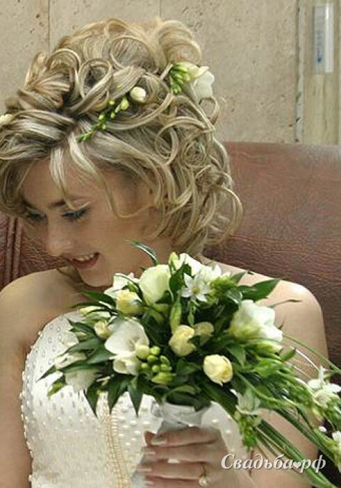 Свадебная причёска с распущенными локонами и живыми цветами придётся по вкусу самым романтичным и нежным натурам. Эта естественная и достаточно простая в исполнении модель продержится целый день. Такая объёмная укладка подходит практически всем типам лица и может быть выполнена на любой длине волос. Причёску можно дополнить фатой.