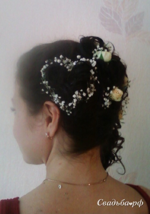 Свадебная прическа для длинных волос. Подойдет к любой форме лица. Представляет собой высоко зачесанные волосы, в греческом стиле, с крупными локонами и переплетениями. При создании можно использовать живые крупные и мелкие цветы. Отлично будет гармонировать с платьем в греческом стиле с открытыми плечами. На создание необходимо до 2,5 часов.