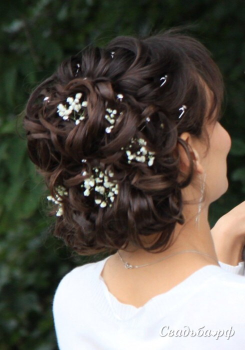 Упругие локоны изящно уложены на макушке. Эта прическа идеально подойдет для осенней невесты, так как прическа прекрасно дополнит образ любой невесты, но сохранит при этом свою форму даже в самую ветреную погоду. Эту прическу прекрасно дополнят живые цветы или небольшие декоративные элементы (бусинки, стразы).