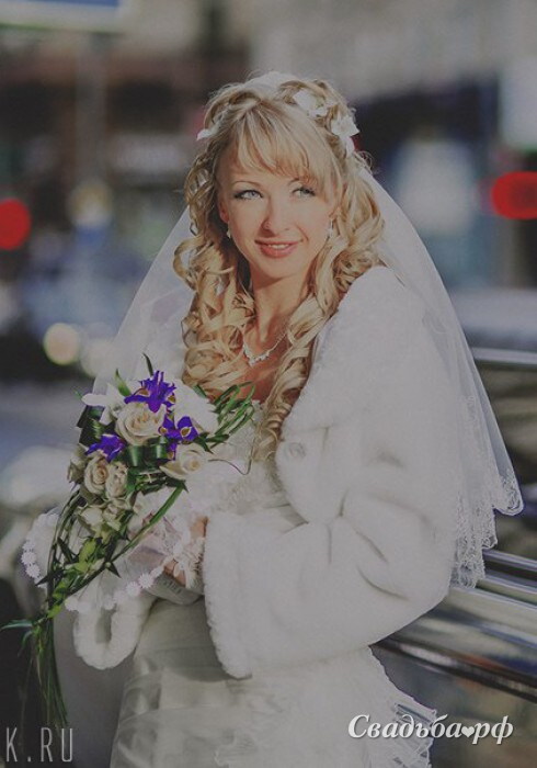 Роскошная прическа для невест с длинными волосами. Волосы уложены в крупные волны, а сверху собраны на затылке. При необходимости можно увеличить объем с помощью прядок из натуральных волос. Прическу можно дополнить живыми цветами. Прическа будет гармонично выглядеть с фатой, но при этом не скроет очарование распущенных волос.