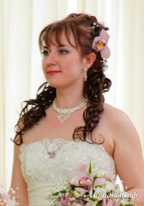 Достойных вариант невест с волосами средней длины. Сочетание челки и кудрявых локонов – это прекрасный вариант для невест, которые планируют отказаться от фаты. Для создания образа используются достаточно объемные цветы, поэтому желательно, чтобы этот элемент присутствовал в букете невесты или бутоньерке жениха.