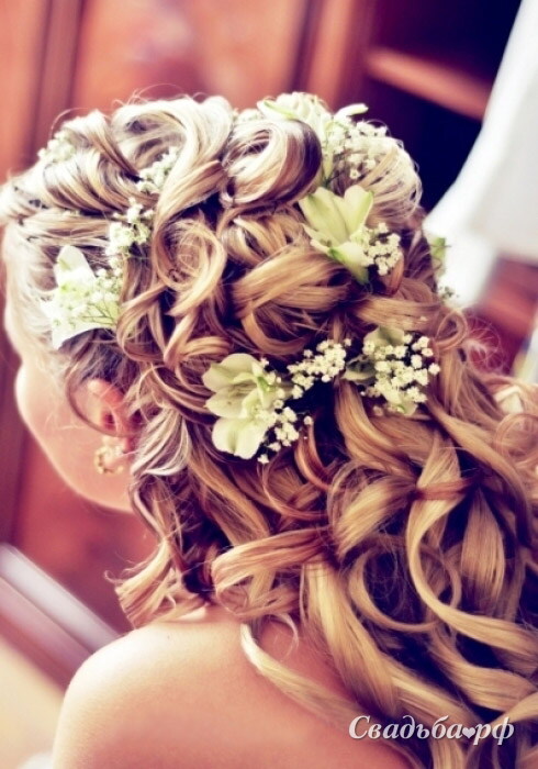 Кудрявые локоны по всей длине волос слегка переплетены между собой на затылке. Прическа выгодно украшена свежими цветами, которые подбираются под каждый конкретный образ. Прическа подойдет для девушек с любым типом лица. Это связано с тем, что спадающие локоны достойно подчеркнут достоинства и скроют недостатки.