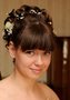 Свадебная причёска для ухоженных волос средней длины. Кудрявые локоны аккуратно собраны на затылке при помощи невидимых шпилек. Прическа позволяет легко закрепить невесомую фату любого фасона. Образ дополнен миниатюрными живыми цветами. Эта прическа подойдет для романтичных девушек, которые носят челку.