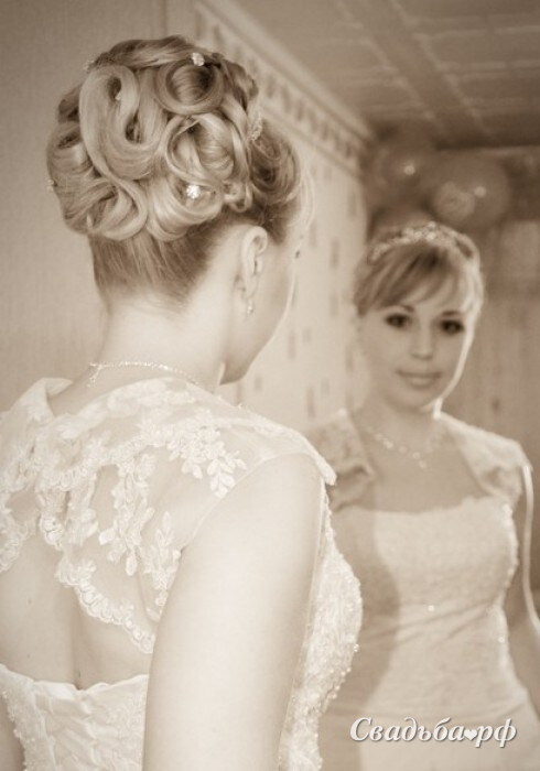 Высокая свадебная причёска в голливудском стиле поможет Вам почувствовать себя звездой романтического фильма. Волосы зачёсаны назад и зафиксированы в объёмный пучок на затылке. Затейливо переплетённые локоны придают укладке особый шик и торжественность. Лёгкая чёлка слегка зачёсана на бок. Причёска украшена крупными жемчужинами.