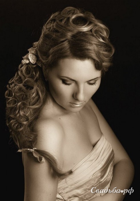 Свадебная прическа с ажурным плетением выполнена на длинных волосах. Пряди убраны со лба, зачёсаны назад и забраны в низкий пучок. Вся голова и хвостик украшены кудряшкам. Укладка дополнена живыми цветами и кокетливым бантиком на конце пучка. Если Вы не можете похвастаться длинными локонами, вы можете использовать накладные пряди.