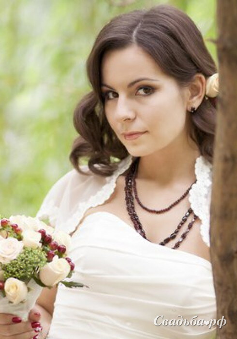 Оригинальная причёска в стиле ретро с живым цветком поможет создать эффектный образ роковой красавицы. Волосы средней длины распущены и завиты в крупные локоны. Косой пробор и открытый лоб привлекают внимание к глазам невесты. Такая укладка легко продержится весь праздник и не потеряет свои безупречные формы. С причёской в ретро-стиле Вы будете неотразимы!