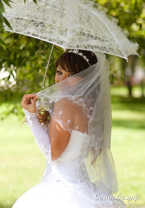 Роскошная свадебная причёска выполнена на распущенных длинных волосах. Пряди слегка забраны назад и завиты в лёгкие локоны, струящиеся вдоль спины. Пышная чёлка придаёт образу романтичность и кокетство. Укладка дополнена сверкающей диадемой и полупрозрачной фатой. Почувствуйте себя с такой причёской настоящей принцессой 21 века!