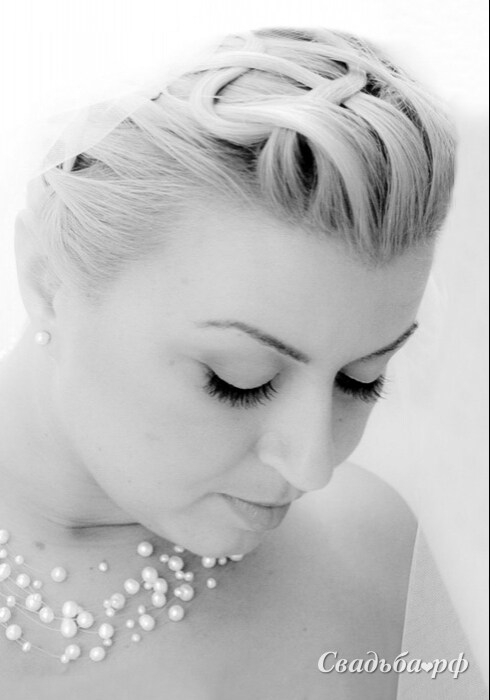 Плетение никогда не выходит из моды. Представленная свадебная причёска украшена затейливым переплетением. Волосы зачёсаны назад и зафиксированы на затылке. Открытый лоб акцентирует внимание на прекрасных глазах невесты. Укладка дополнена полупрозрачной фатой. Такая причёска может быть выполнена практически на любой длине волос.