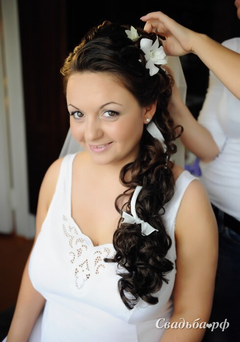Свадебная причёска в греческом стиле роскошно смотрится на длинных и густых волосах. Пряди зачёсываются со лба назад и фиксируются на затылке в объёмную шишку. Изящные локоны переплетаются между собой и струятся на плечи. Такую романтичную и очень женственную модель можно украсить цветами, бусинами или кокетливыми бантиками.