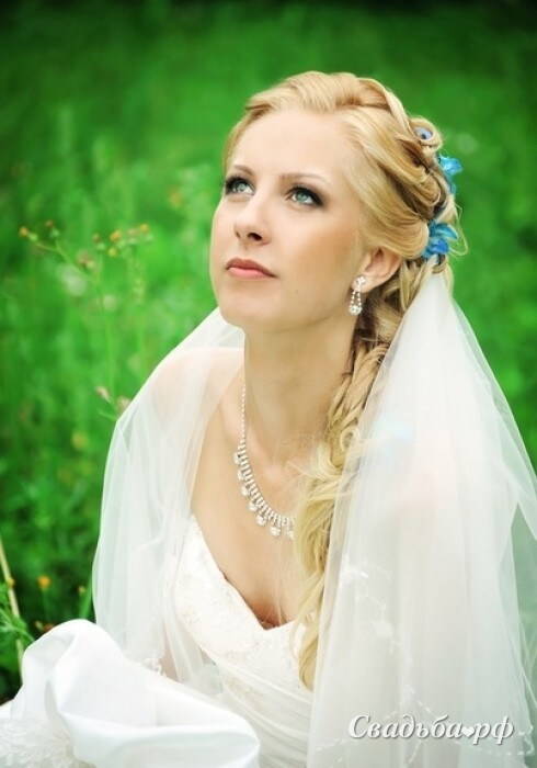 Свадебная причёска в греческом стиле дополнена потрясающей фатой. Пряди со лба зачёсаны назад и зафиксированы на затылке. Объёмные локоны струятся на плечи и спину. Такую роскошную причёску можно украсить бусинами и живыми цветами. Укладка выполняется на длинных и густых волосах. Эта модель акцентирует внимание на лице невесты.