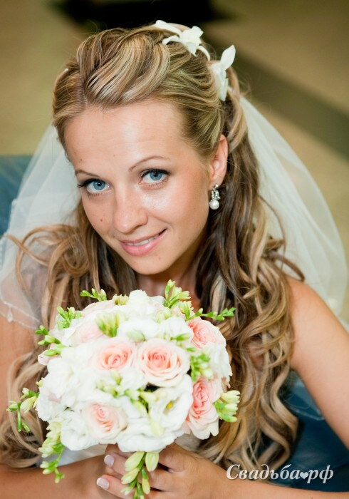 Свадебная причёска в греческом стиле украшена фатой и цветами. Пряди со лба зачёсаны назад и зафиксированы на затылке. Целый каскад локонов струится на плечи и спину. Такая укладка выглядит очень естественно и романтично. Модель выполняется на длинных и густых волосах. Дополнить образ можно пышным платьем с открытой зоной декольте.