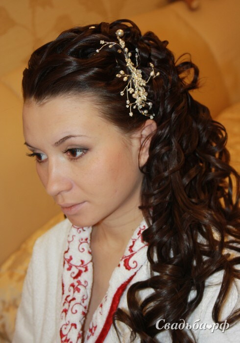 Свадебная причёска в греческом стиле эффектно смотрится на длинных и густых волосах. Каждая прядь уложена в изящный локон. Волосы забраны со лба и легко зафиксированы на боку. Такая роскошная модель акцентирует внимание на лице невесты. Целый каскад кудрей падает на плечи и спину. Причёску можно дополнить оригинальной заколкой или живыми цветами.