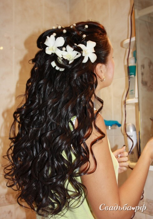 Свадебная причёска поможет вам почувствовать себя настоящей богиней. Эта роскошная укладка подходит обладательницам длинных и ухоженных волос. Пряди зачёсываются назад и фиксируются на затылке в объёмную шишку. Целый каскад изящных локонов падает на плечи и спину. Модель можно украсить цветами, бусинами или сверкающей диадемой.