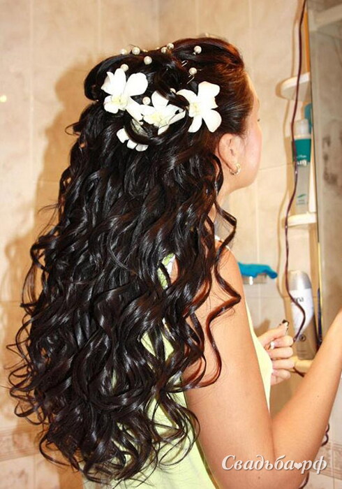 Свадебная причёска выполняется на длинных и густых волосах. Пряди со лба зачёсываются назад и фиксируются на затылке. Целый каскад изящных локонов струится на плечи и спину. Такую роскошную причёску можно украсить живыми цветами, бусинами или сверкающей диадемой. Платье с открытой зоной декольте дополнит образ.