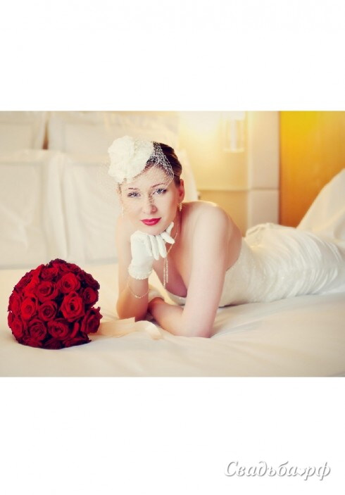 Эффектная свадебная причёска в ретро-стиле для самой кокетливой и стильной невесты. Волосы убраны со лба, гладко зачёсаны назад и дополнены дизайнерской шляпкой с вуалью. Такая укладка роскошно смотрится с ярко-красными губами и стильными стрелочками на глазах. Отличный вариант для коротких волос. Вы будете неотразимы!