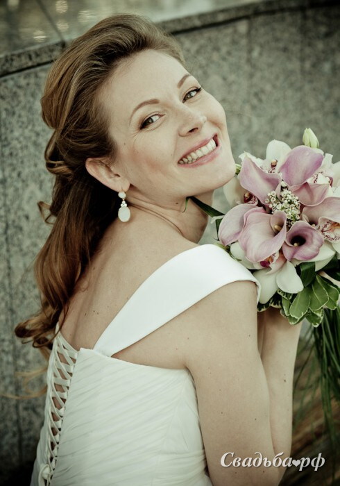 Ваша улыбка завораживает, а глаза светятся от счастья. Чтобы акцентировать внимание на прекрасном личике невесты, стилист убрал волосы со лба и легко закрепил их на затылке. Свободные пряди этой объёмной укладки струятся по плечам и спине. Такая свадебная причёска не терпит массивных украшений. Дополнить модель можно несколькими живыми цветами.