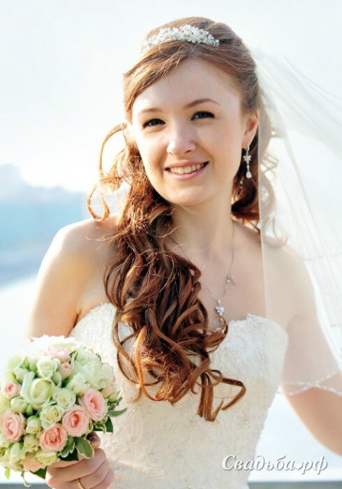 Роскошная причёска в греческом стиле подойдёт обладательницам длинных и густых волос. В ином случае используются накладные пряди. Чёлка кокетливо зачёсана на бок. Волосы убраны назад и объёмно зафиксированы на затылке. Копна мягких локонов струится вдоль спины. Причёска украшена диадемой и фатой из полупрозрачной ткани.