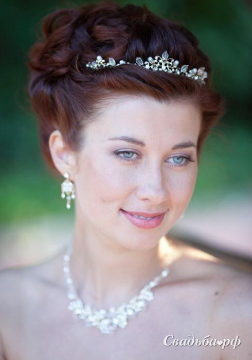 Очаровательная свадебная причёска для настоящей принцессы 21 века. Волосы со лба убраны назад и зачёсаны на затылок. Эта высокая укладка с искусно переплетёнными локонами дополнена сверкающей диадемой. Можно украсить фатой и жемчужинами. Отличный вариант для худенького или вытянутого личика. Укладка выполняется на длинных и средних волосах.
