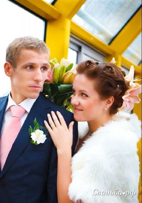 Романтичная свадебная причёска для самых молодых и обворожительных невест. Чёлка убрана со лба несколькими широкими прядями. Волосы зачёсаны назад и зафиксированы в низкий пучок. Причёска украшена сверкающими бусинами и крупными бутонами живых цветов. Модель выполняется практически на любой длине волос. Сама весна будет завидовать Вашей свежести!