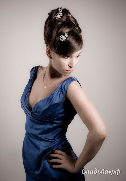 Свадебная причёска с собранными волосами акцентирует внимание на лице и шее невесты. Волосы зачёсаны назад и зафиксированы в объёмную шишку на затылке. Широкая прядь обрамляет лицо. Искусное переплетение локонов украшено сверкающими заколками. Представленную модель можно дополнить лёгкой фатой. Причёска выполняется на длинных и густых волосах.