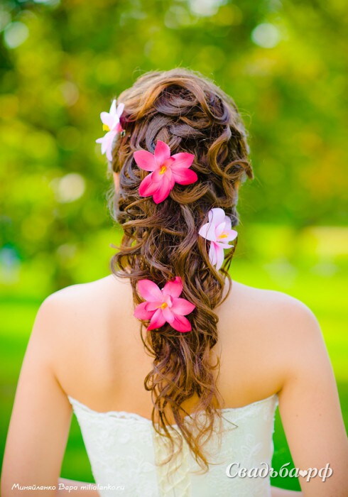 Свадебная причёска в греческом стиле придётся по душе обладательницам длинных и ухоженных волос. Пряди зачёсываются назад и фиксируются на затылке в объёмную конструкцию. Изящные локоны, переплетенные между собой, струятся на плечи и спину. Причёску можно украсить живыми цветами, бусинами или сверкающей диадемой.