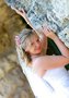 Свадебная причёска в греческом стиле выполнена с использованием накладных прядей. Несколько локонов, словно выбившихся из общей композиции, придают образу романтичность и игривость. Волосы зачёсаны назад и зафиксированы на затылке. Мягкие волны кудрей падают на плечи и спину. Причёска украшена живыми цветами и фатой.