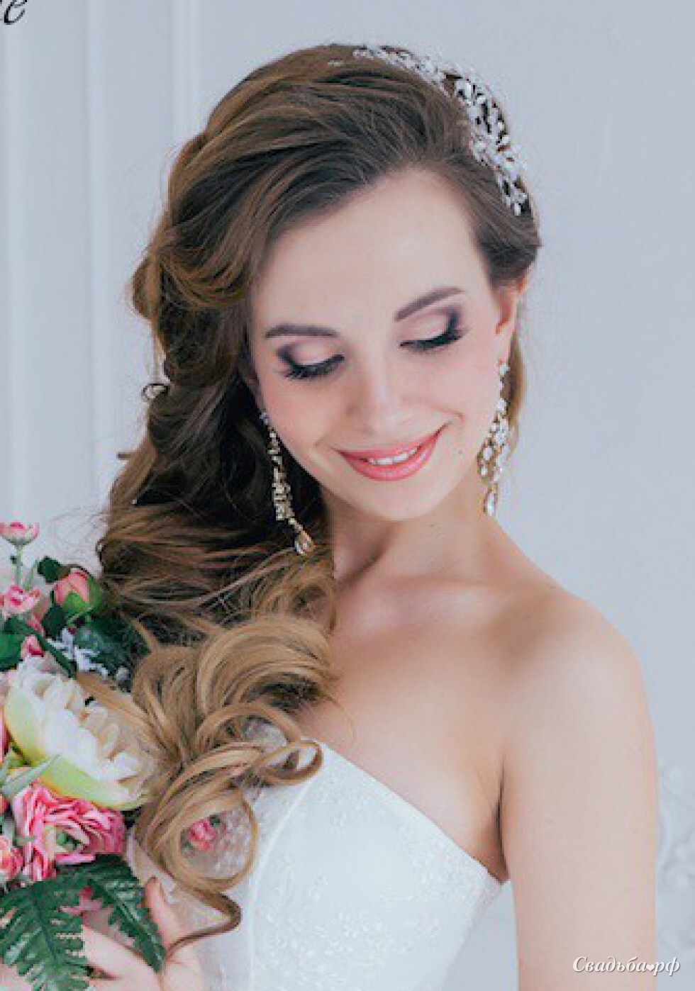Данную прическу можно выполнить на любой длинне волос, если не хватает длинны или густоты, то возможно получить такой же результат, добавив накладные пряди из натуральных волос! Прическа будет держаться более суток! Данная прическа украшена "Веткой" из страз, что делает ее более нежной и романтичной - как у принцессы из сказки. Данная прическа подойдет почти к любому фасону платья. Так как у невесты открытое декольте, то было бы логичнее украсить эту зону колье, но мы решили его заменить на длинные серьги! Передняя часть волос невесты уложена с учетом особенностей формы лица и длинны волос этой зоны. К дааной прическе можно крепить фату на наивысшую точку головы - ничего проминаться не будет, т к в прическе применен плотный маленький валик, то сохраняет жесткость в месте прикрепления фаты. Макияж средней яркости, светлое веко и мягкая растушевка темного оттенка в уголках век. Гамма макияжа подбирается не под цвет платья или букета!!! - подбирается под цветотип человека: цвет глаз, кожи, волос. Другие работы вы можете увидеть на моем сайте www.vizaj.ru
