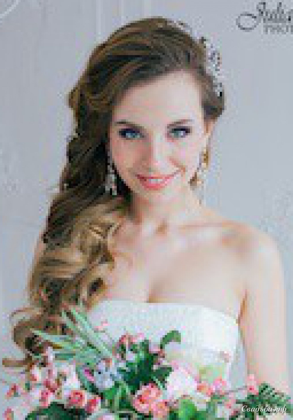 Данную прическу можно выполнить на любой длинне волос, если не хватает длинны или густоты, то возможно получить такой же результат, добавив накладные пряди из натуральных волос! Прическа будет держаться более суток! Данная прическа украшена "Веткой" из страз, что делает ее более нежной и романтичной - как у принцессы из сказки. Данная прическа подойдет почти к любому фасону платья. Так как у невесты открытое декольте, то было бы логичнее украсить эту зону колье, но мы решили его заменить на длинные серьги! Передняя часть волос невесты уложена с учетом особенностей формы лица и длинны волос этой зоны. К дааной прическе можно крепить фату на наивысшую точку головы - ничего проминаться не будет, т к в прическе применен плотный маленький валик, то сохраняет жесткость в месте прикрепления фаты. Макияж средней яркости, светлое веко и мягкая растушевка темного оттенка в уголках век. Гамма макияжа подбирается не под цвет платья или букета!!! - подбирается под цветотип человека: цвет глаз, кожи, волос. Другие работы вы можете увидеть на моем сайте www.vizaj.ru