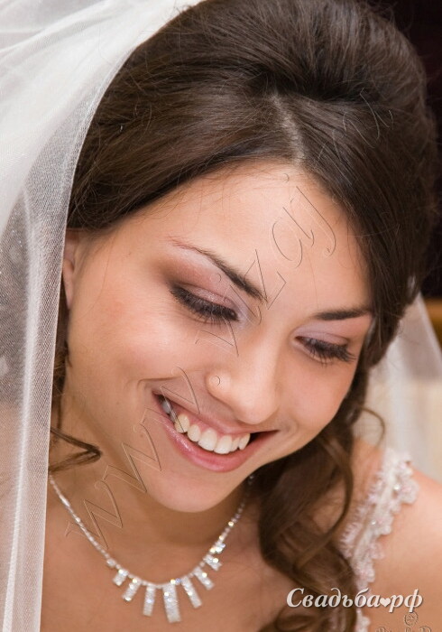 Свадебная причёска с фатой поможет создать невинный и очень романтичный образ невесты. Широкие пряди обрамляют лоб. Волосы зафиксированы на затылке. Изящные локоны мягкими волнами струятся на плечи и спину. Такая естественная причёска будет отлично сочетаться с кружевным платьем и открытой зоной декольте.