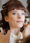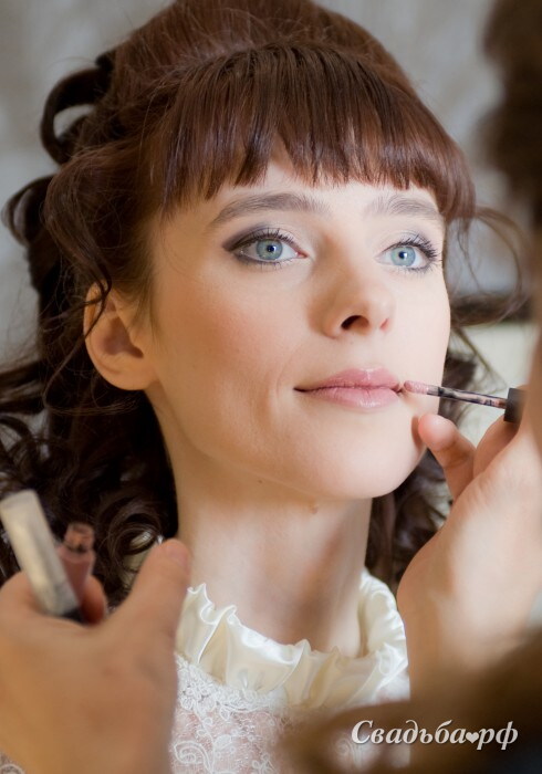 Свадебная причёска с чёлкой придётся по вкусу самым романтичным и нежным красавицам. Волосы зачёсаны назад и легко зафиксированы на затылке. Изящные локоны струятся на плечи и вдоль спины. Несколько прядей по бокам придают образу особый шарм. Эта модель смотрится очень естественно и свежо. Отличный вариант для длинных и средних волос.
