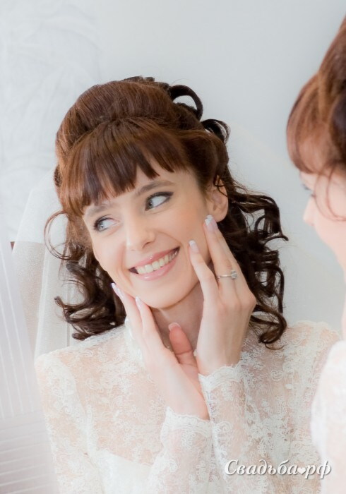 Свадебная причёска с чёлкой поможет создать естественный и очень романтичный образ невесты. Волосы забраны назад и зафиксированы на затылке. Пышные локоны каскадом падают на плечи и спину. Такую укладку можно дополнить фатой, живыми цветами или несколькими бусинами. Причёска будет роскошно смотреться на средних или длинных волосах.