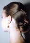 Свадебная прическа выполнена в достаточно строгом стиле - волосы зачесаны назад, немного переплетены и собраны в пучок на уровне шеи. Эта прическа подойдет к закрытому свадебному платью, а также удачно дополнит праздничный брючный наряд. Из аксессуаров можно использовать аккуратные сережки-капельки и тоненькую цепочку с подвеской на шею.