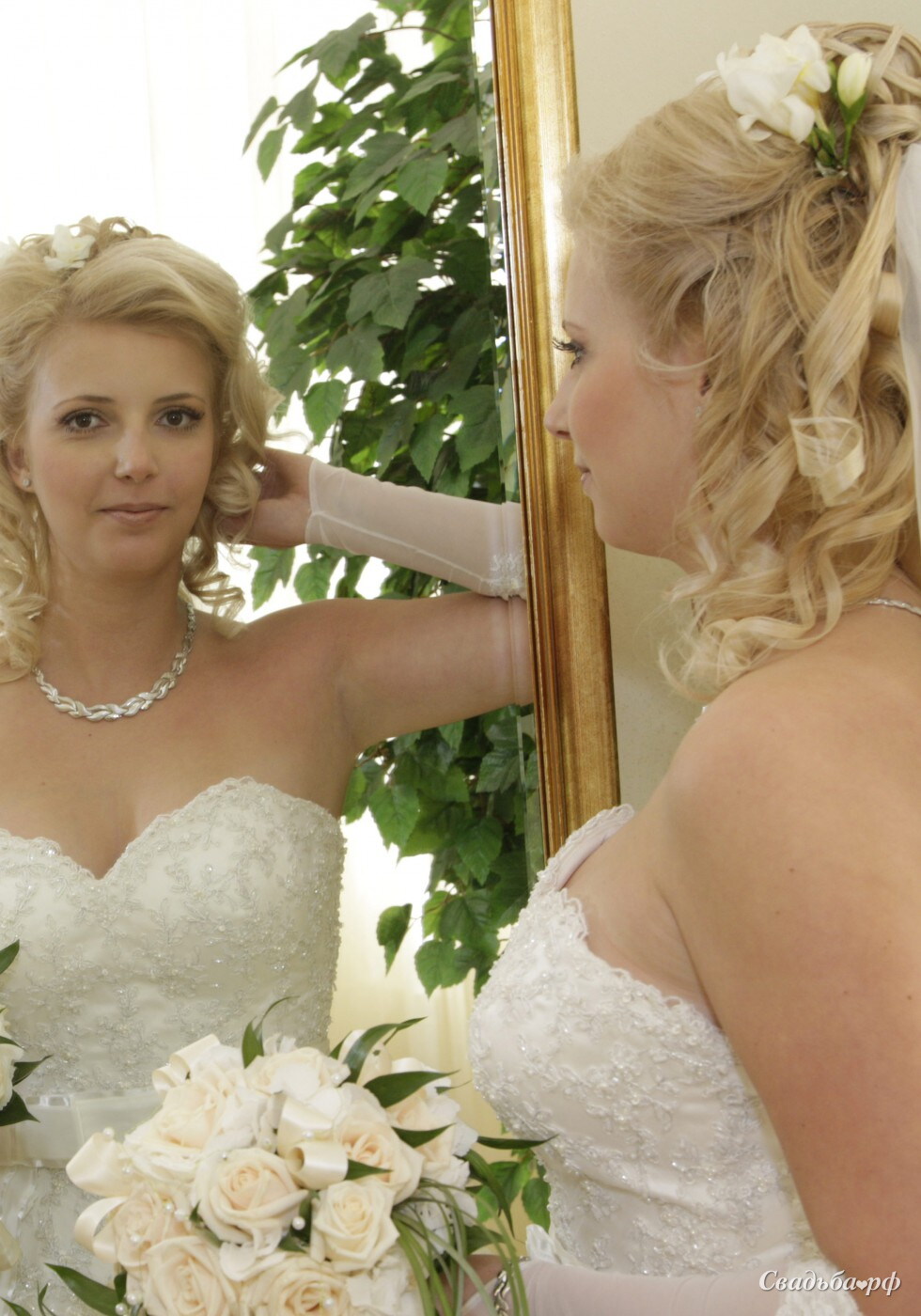 Эта свадебная прическа для обладательниц длинных или средней длины волос. Спереди волосы слегка начесаны и уложены в пробор, сзади мягкие локоны нежно струятся по спине и асимметрично заколоты. Прическа украшена небольшими живыми цветами и несколькими жемчужинами. Удачно завершит образ невесты неяркий макияж и интересное украшение на шею.