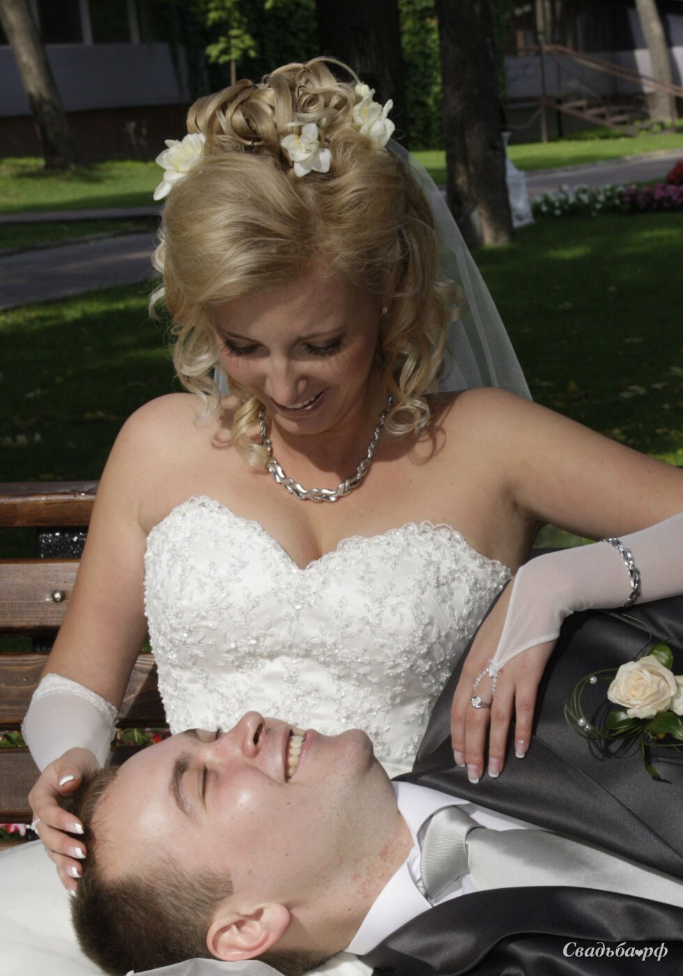Эта свадебная прическа для обладательниц длинных или средней длины волос и девушек, которые привыкли носить челку. Спереди волосы слегка начесаны и уложены в пробор, сзади мягкие локоны нежно струятся по спине и асимметрично заколоты. Челка уложена набок. Прическа украшена мелкими цветочками. Удачно завершит образ невесты неяркий макияж.