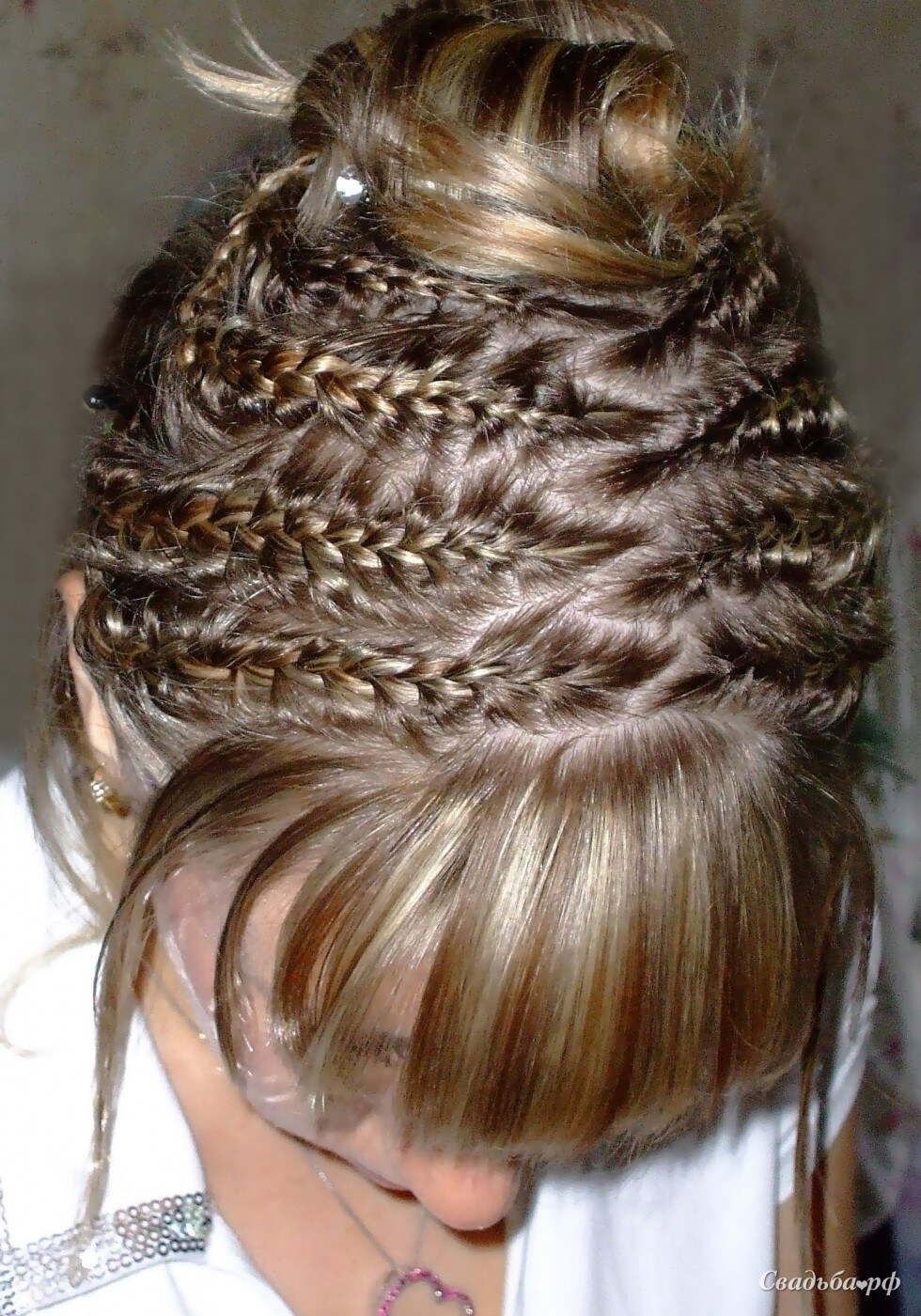 Любительницы нестандартных решений и креативные личности по достоинству оценят эту прическу, но подойдет она исключительно для длинных волос. Спереди волосы уложены в пробор зигзагом и от него берут начало мелкие косички, которые оплетают голову по кругу и сзади плавно переходят в небольшой объемный пучок. Особенно удачно такая прическа смотрится с челкой.