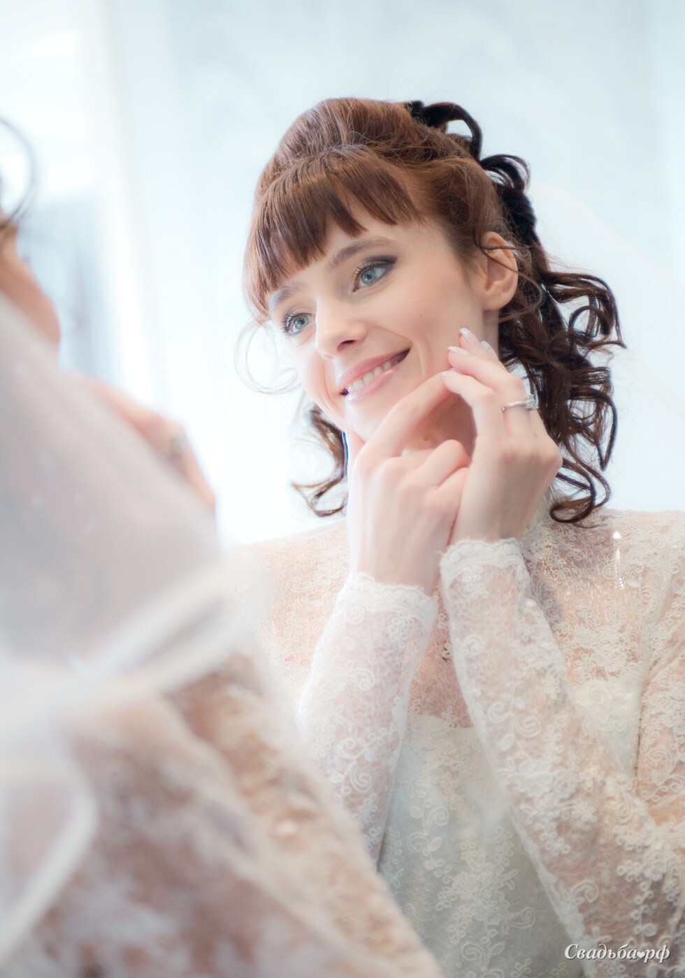 Отличная свадебная прическа для девушек, которые привыкли носить челку. Спереди волосы начесаны и уложены, сзади заколоты для придания объема и дальше просто струятся мелкими локонами. Эта прическа отлично подойдет для свадебного наряда с воротником-стойкой. Дополнить образ невесты можно ярким макияжем глаз, например, смоки айс.