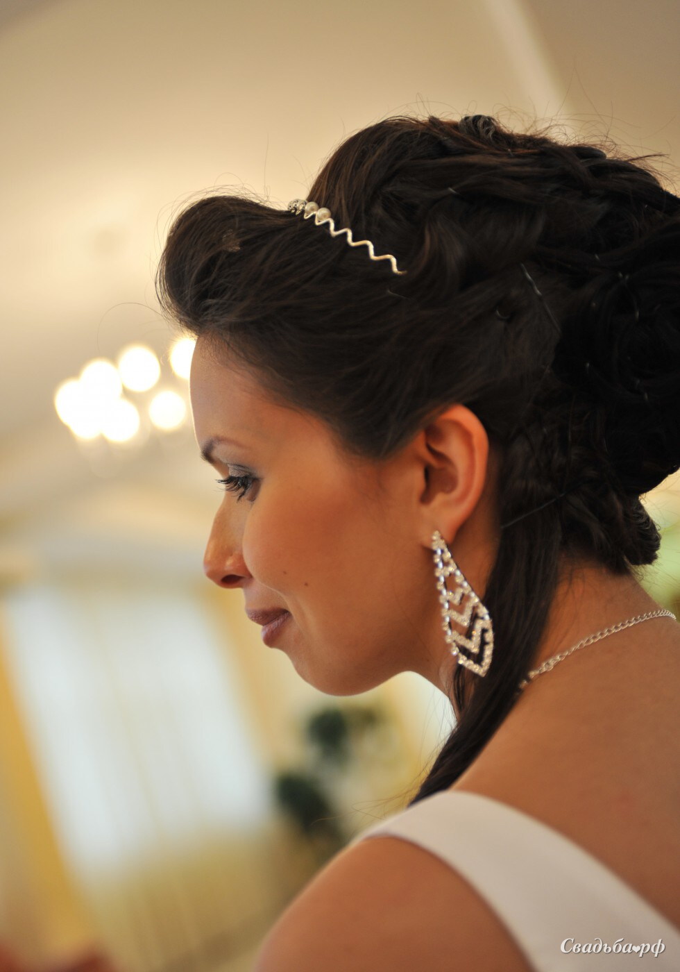 Стильная и современная свадебная прическа. Волосы начесаны и собраны в объемную копну сзади, из которой выпадает один длинный локон. Спереди прическу украшает ободок-диадема с россыпью крупных камней, а сзади - ажурная коса. Идеально с такой прической будут гармонировать объемные серьги с крупными камнями и такое же ожерелье.
