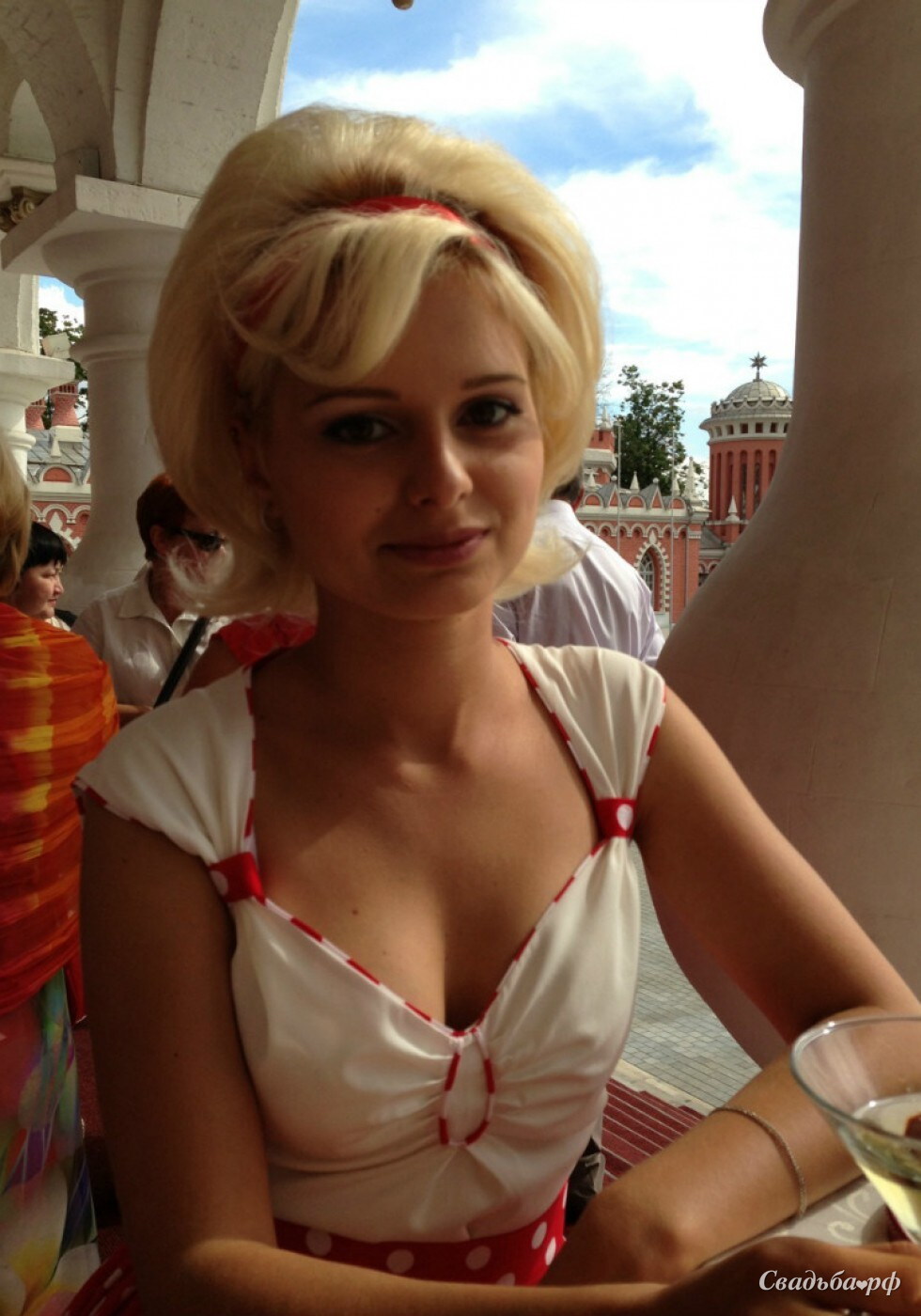 Безупречная свадебная прическа в стиле Мерлин Монро подойдет для девушек, которые носят волосы средней длины. Челку и пышный начес разделяет яркая атласная лента, что придает образу пикантность и необычность. Подойдет к короткому свадебному наряду. Из украшений будет прекрасно сочетаться с аккуратными серьгами и тоненькой цепочкой с подвеской.