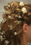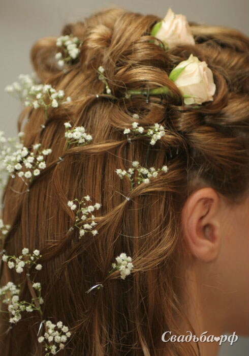 Свадебная причёска с живыми цветами и лёгким узором подойдёт романтичным и молоденьким невестам. Пряди убираются со лба и изящно фиксируются на затылке. Остальные волосы каскадом струятся на плечи и спину. Такая весенняя причёска будет отлично смотреться с платьем из нежной ткани. Оптимальный вариант для худенького личика.