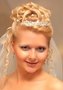 Свадебная причёска с собранными волосами акцентирует внимание на личике и шее прекрасной невесты. Пряди забраны наверх и там переплетены между собой и надёжно зафиксированы в виде корзинки. По бокам спускаются изящные кудряшки. Представленная укладка дополнена диадемой и миниатюрными заколками – цветочками.