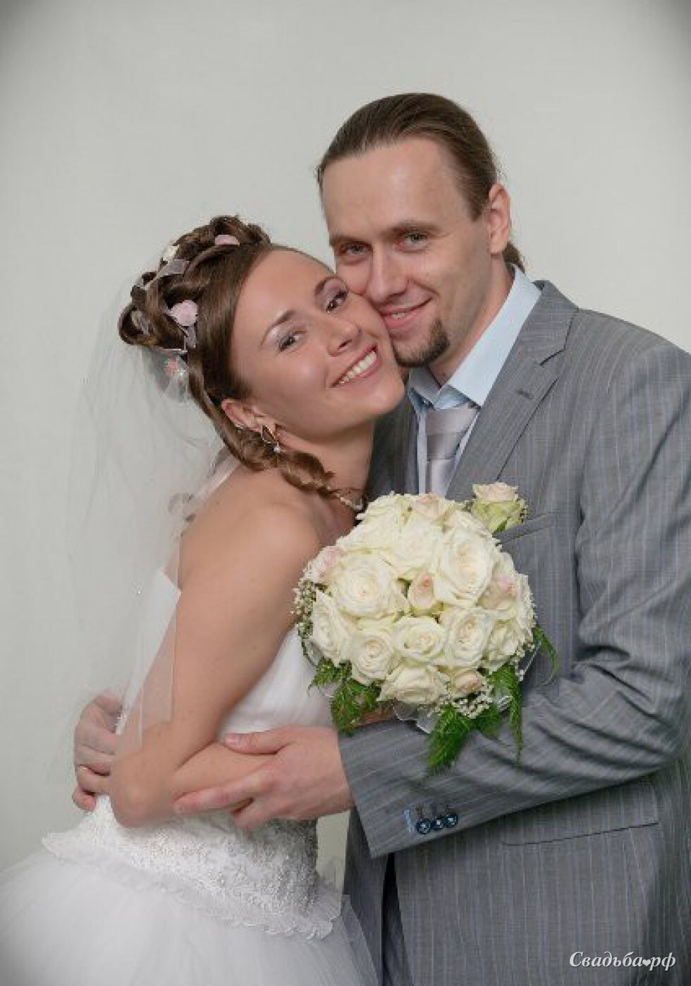 Свадебная причёска с фатой никогда не выйдет из моды! Волосы убраны со лба и зачёсаны вверх, затем зафиксированы на затылке. Широкие пряди переплетены между собой и напоминают объёмную корзинку. По бокам спускаются изящные кудри, придающие образу кокетство. Причёска дополнена лентами и заколками-цветами.