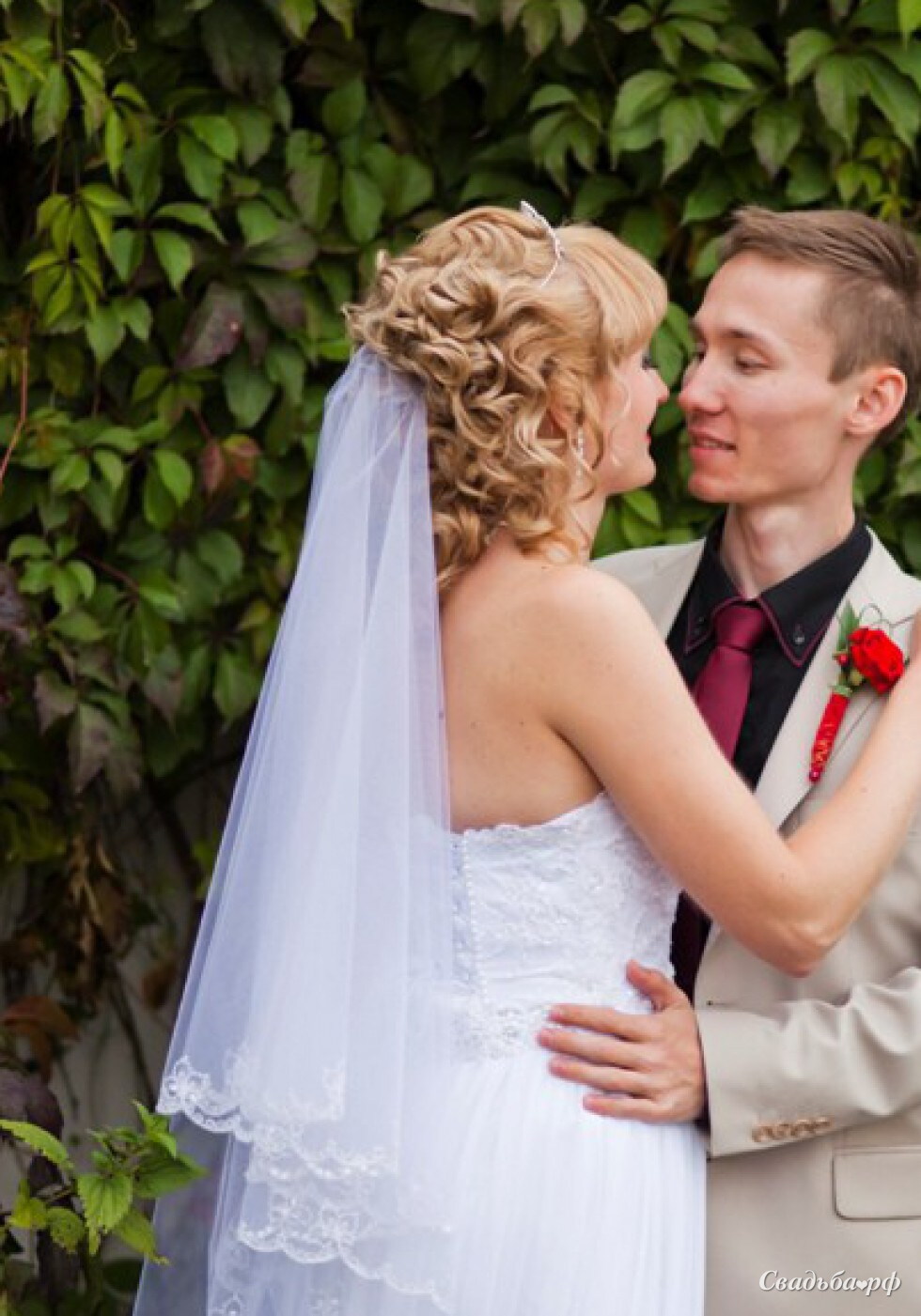 Свадебная причёска с распущенными волосами и фатой поможет создать естественный и по-весеннему свежий образ невесты. Густая чёлка закрывает лоб. Волосы средней длины уложены в мягкие кудри, надёжно зафиксированные лаком. Такая причёска продержится весь день и не потеряет своих безупречных форм. Дополнение – небольшая диадема.