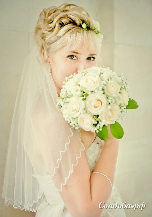 Свадебная причёска с собранными волосами и нежной фатой будет отлично смотреться с любым нарядом. Лёгкая чёлка особенно гармонично сочетается со множеством локонов, изящно уложенных на голове. Такая объёмная укладка зрительно добавит невесте немного роста. Модель может быть декорирована живыми цветами, диадемой или бусинами.